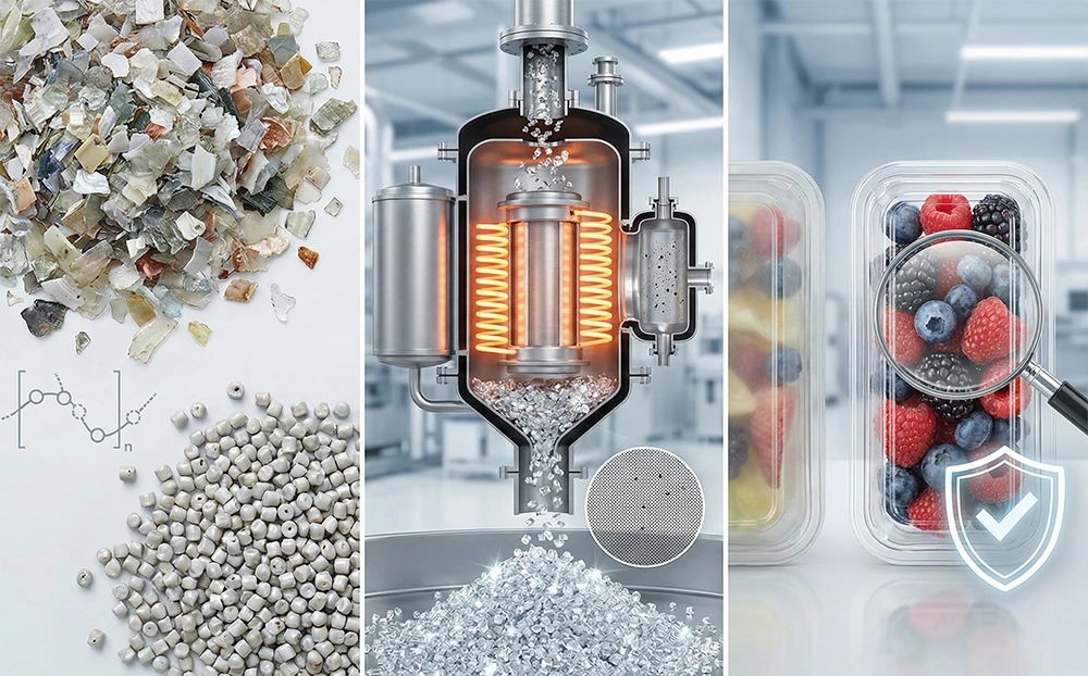 Collage of rpet flakes, molecular decontamination reactor, and a magnifying glass inspecting clear blueberry packaging.