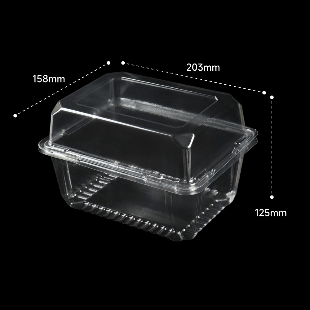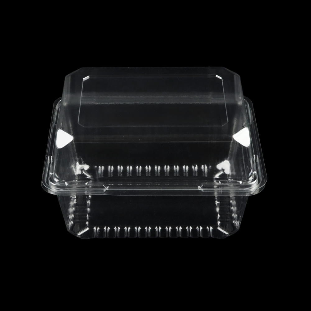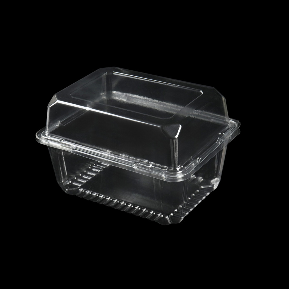 A clear, food-grade PET clamshell container designed to highlight and protect fresh food items during storage and display.