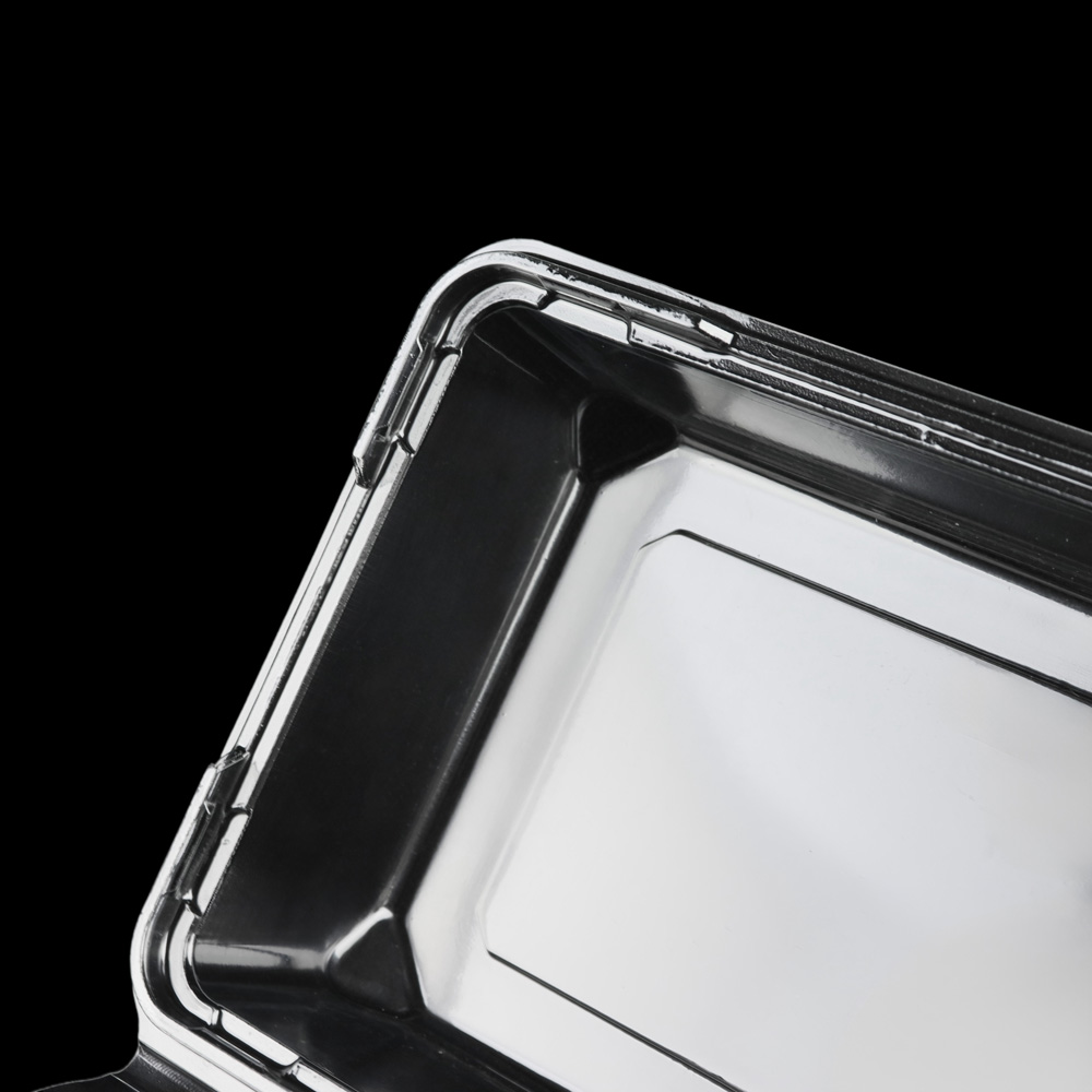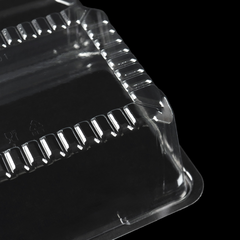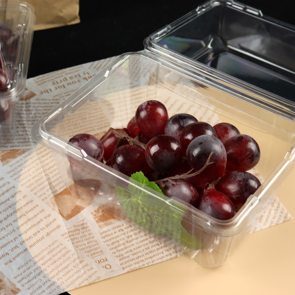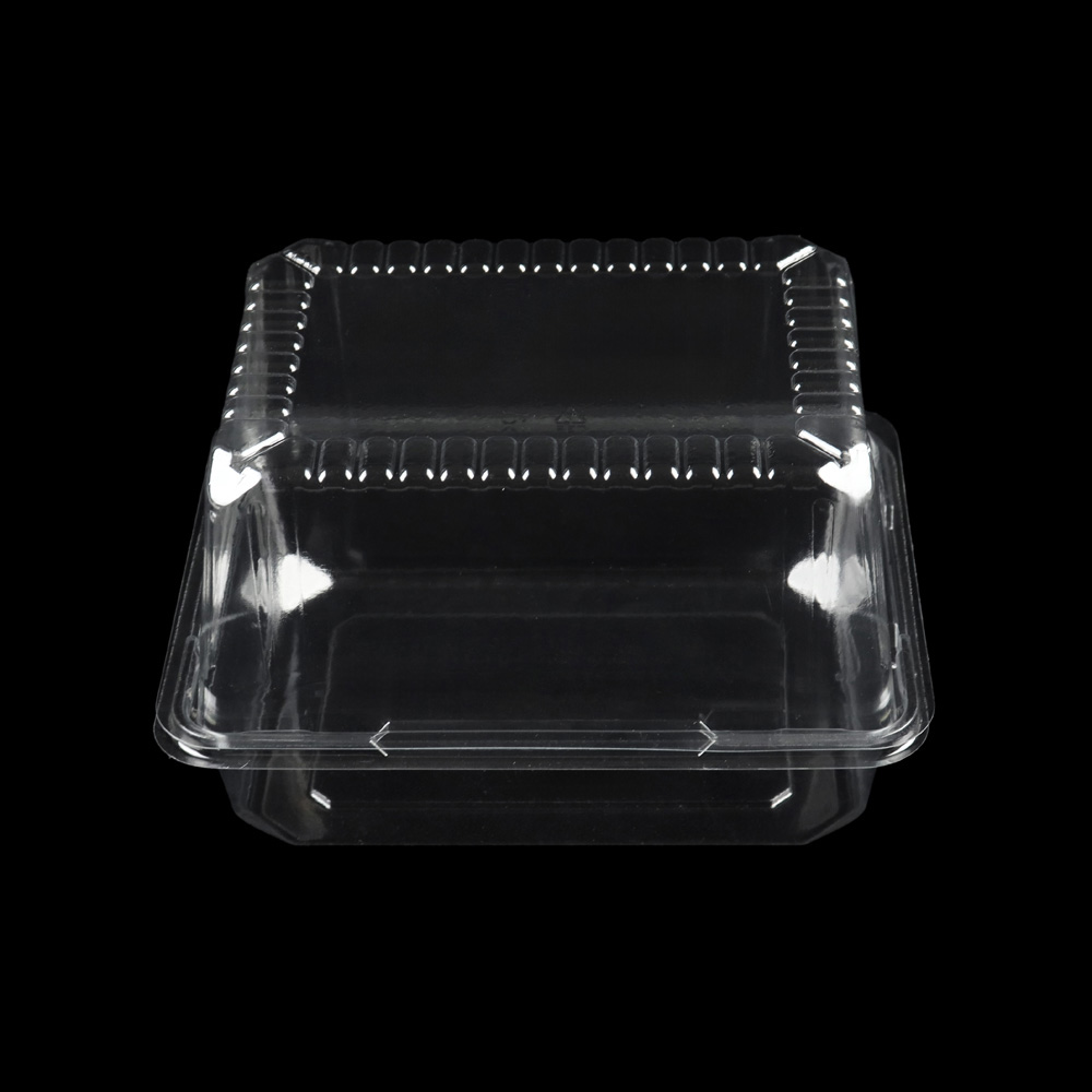 A clear, food-grade PET clamshell container designed to highlight and protect fresh food items during storage and display.